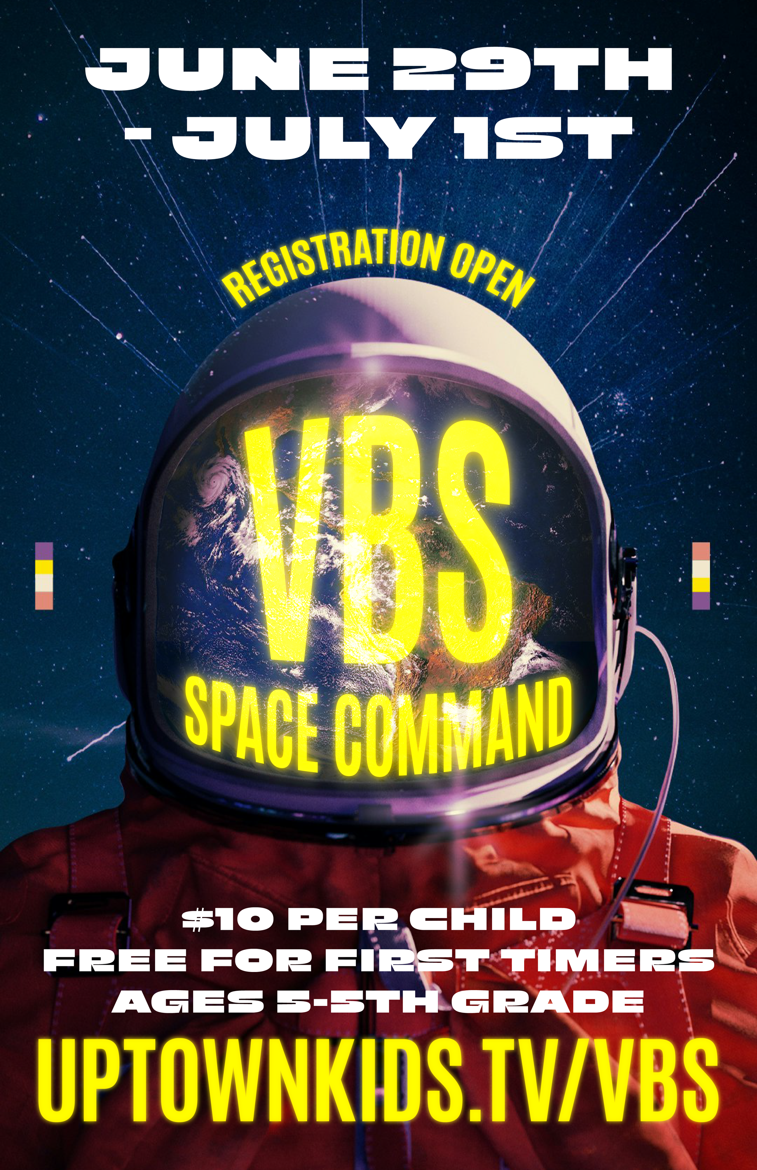 Save the date! VBS Space Command 2026 will take place on Monday June 29th-Wednesday July 1st from 9am-noon. Registration is open! We hope to see you there!